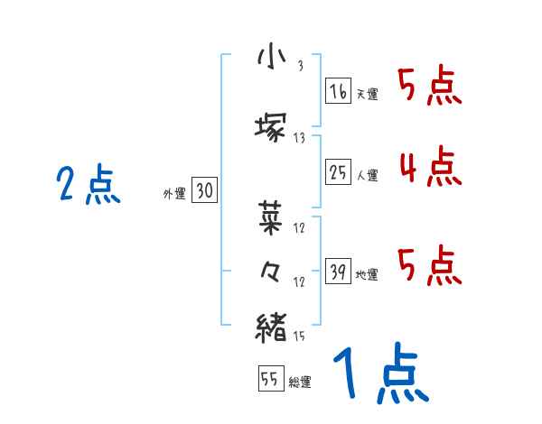 外運![]() | 小塚菜々緒さんの外運は30画の2つ星!浮き沈みの激しさに注意しましょう。 生活面を象徴する運勢です。外部から受ける影響力を表し、結婚運、家庭運や職場、環境への順応性を表します。 |