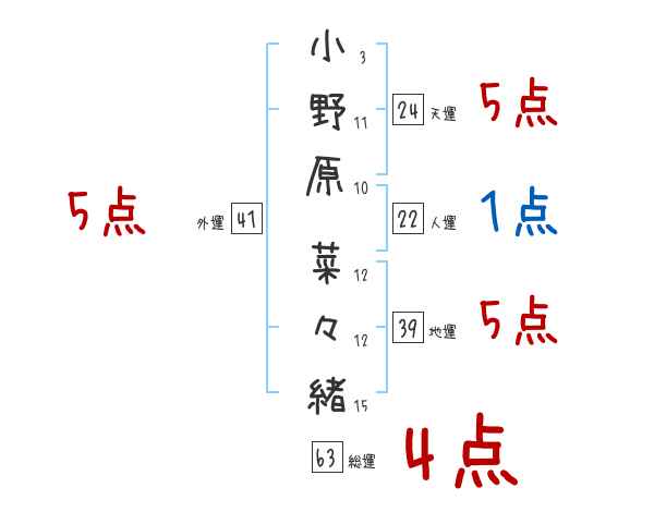 天運![]() | 小野原菜々緒さんの天運は24画の5つ星!家庭運が良く順調な人生。金運にも恵まれる。 家系が持つ宿命的な運勢を表します。祖先から受け継いだ苗字ですので自分の力が及びません。家柄を象徴します。 |