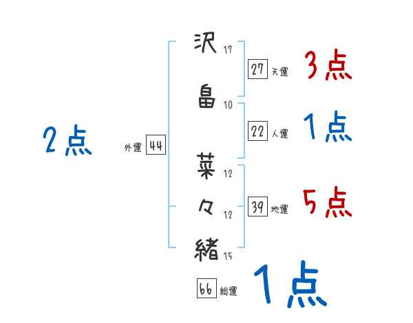 総運![]() | 沢畠菜々緒さんの総運は66画の1つ星!迷うことが多く挫折しやすい傾向が。辛抱強く物事に取り組みましょう。 あなたの人生を表す1番重要な運勢です。生涯を通じて影響する総合運となり、主に50歳以降の晩年期に影響を及ぼします。 |