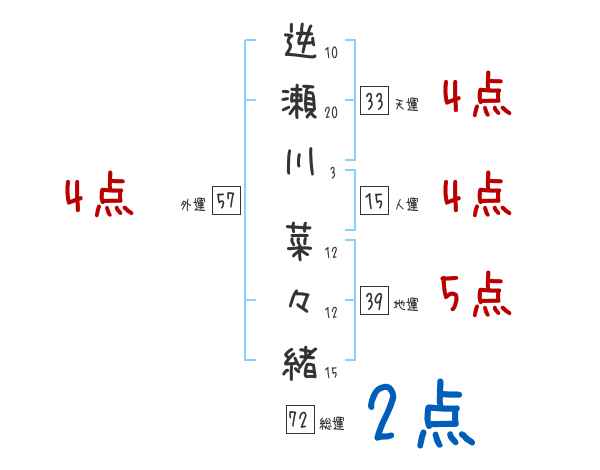 天運![]() | 逆瀬川菜々緒さんの天運は33画の4つ星!権力志向でプライドが高い。勇気があり運を切り開き成功する。 家系が持つ宿命的な運勢を表します。祖先から受け継いだ苗字ですので自分の力が及びません。家柄を象徴します。 |