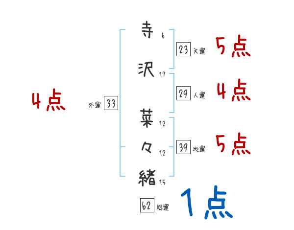 外運![]() | 寺沢菜々緒さんの外運は33画の4つ星!権力志向でプライドが高い。勇気があり運を切り開き成功する。 生活面を象徴する運勢です。外部から受ける影響力を表し、結婚運、家庭運や職場、環境への順応性を表します。 |