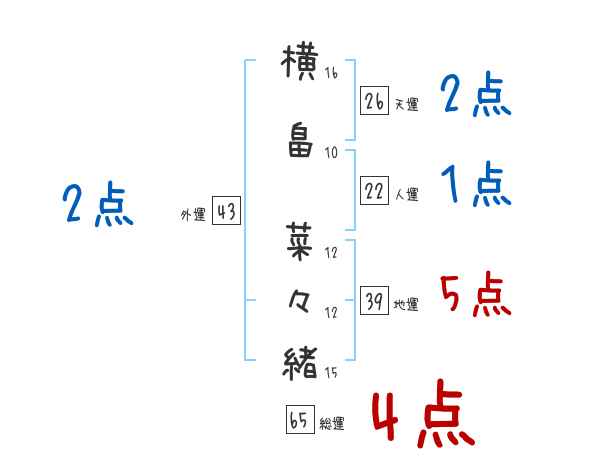 総運![]() | 横畠菜々緒さんの総運は65画の4つ星!幸運に恵まれ繁栄する。包容力がある。 あなたの人生を表す1番重要な運勢です。生涯を通じて影響する総合運となり、主に50歳以降の晩年期に影響を及ぼします。 |