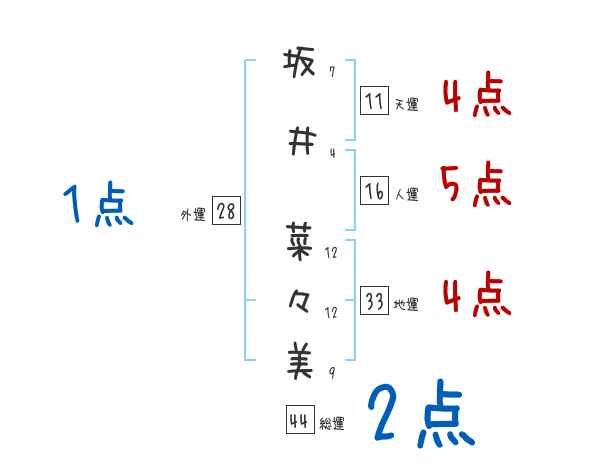 天運![]() | 坂井菜々美さんの天運は11画の4つ星!着実に富や地位を得る幸運な人生。 家系が持つ宿命的な運勢を表します。祖先から受け継いだ苗字ですので自分の力が及びません。家柄を象徴します。 |