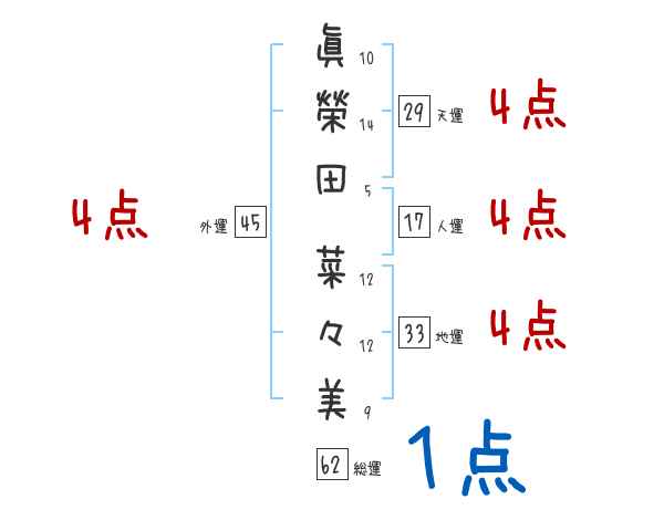 天運![]() | 眞榮田菜々美さんの天運は29画の4つ星!完全主義で才能がある。厳格な心の持ち主。 家系が持つ宿命的な運勢を表します。祖先から受け継いだ苗字ですので自分の力が及びません。家柄を象徴します。 |