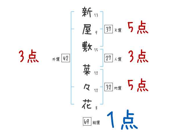 地運![]() | 新屋敷菜々花さんの地運は32画の5つ星!柔軟性があり成功する。チャンスが多く金運が良い。 個性を表す基礎的な運勢です。性格形成や対人関係、行動力など家庭環境に影響されます。主に誕生してから20歳くらいまでの若年期の運勢を表します。 |