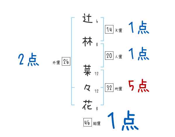 外運![]() | 辻林菜々花さんの外運は26画の2つ星!波瀾万丈かも。信頼できる人を大事にしましょう。 生活面を象徴する運勢です。外部から受ける影響力を表し、結婚運、家庭運や職場、環境への順応性を表します。 |