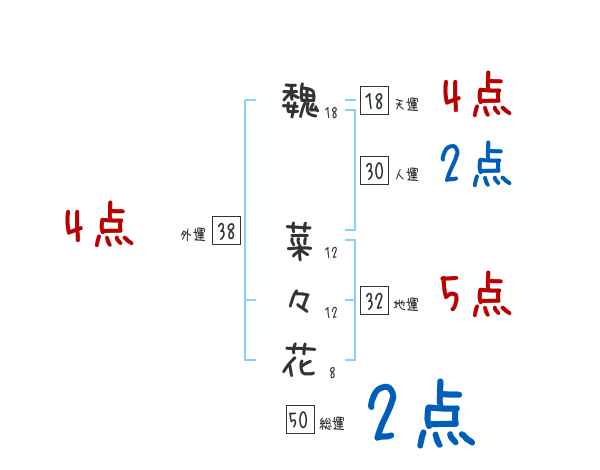 天運![]() | 魏菜々花さんの天運は18画の4つ星!情熱的で剛気。忍耐力があり信頼される。 家系が持つ宿命的な運勢を表します。祖先から受け継いだ苗字ですので自分の力が及びません。家柄を象徴します。 |