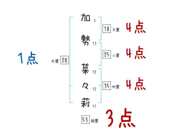 天運![]() | 加勢菜々莉さんの天運は18画の4つ星!情熱的で剛気。忍耐力があり信頼される。 家系が持つ宿命的な運勢を表します。祖先から受け継いだ苗字ですので自分の力が及びません。家柄を象徴します。 |