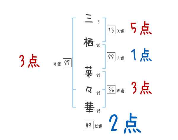 天運![]() | 三栖菜々華さんの天運は13画の5つ星!才能に恵まれ人気がある。名声を手に入れる。円満な人生。 家系が持つ宿命的な運勢を表します。祖先から受け継いだ苗字ですので自分の力が及びません。家柄を象徴します。 |