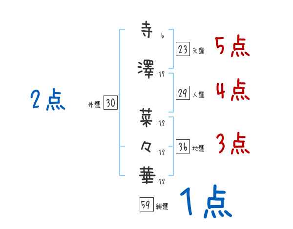 天運![]() | 寺澤菜々華さんの天運は23画の5つ星!想像力に優れ活力がある。一代で成功し名誉を手に入れる。 家系が持つ宿命的な運勢を表します。祖先から受け継いだ苗字ですので自分の力が及びません。家柄を象徴します。 |