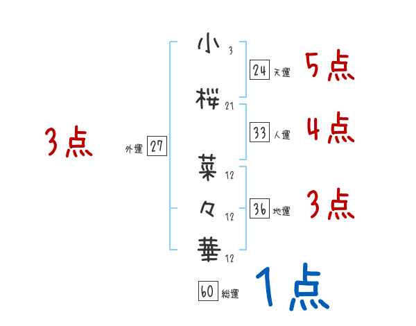 外運![]() | 小桜菜々華さんの外運は27画の3つ星!頭脳明晰だが強情で摩擦が多い傾向。孤立に注意。 生活面を象徴する運勢です。外部から受ける影響力を表し、結婚運、家庭運や職場、環境への順応性を表します。 |