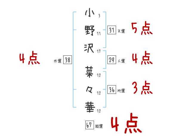 外運![]() | 小野沢菜々華さんの外運は38画の4つ星!温厚な性格で技術的な才能を発揮する。職人的な仕事に向いている。 生活面を象徴する運勢です。外部から受ける影響力を表し、結婚運、家庭運や職場、環境への順応性を表します。 |