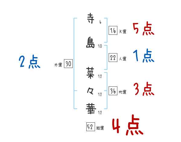 天運![]() | 寺島菜々華さんの天運は16画の5つ星!人望が厚く大きく発展する。逆転成功が見える。 家系が持つ宿命的な運勢を表します。祖先から受け継いだ苗字ですので自分の力が及びません。家柄を象徴します。 |
