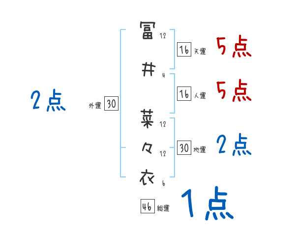 天運![]() | 冨井菜々衣さんの天運は16画の5つ星!人望が厚く大きく発展する。逆転成功が見える。 家系が持つ宿命的な運勢を表します。祖先から受け継いだ苗字ですので自分の力が及びません。家柄を象徴します。 |
