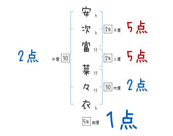 外運![]() | 安次富菜々衣さんの外運は30画の2つ星!浮き沈みの激しさに注意しましょう。 生活面を象徴する運勢です。外部から受ける影響力を表し、結婚運、家庭運や職場、環境への順応性を表します。 |