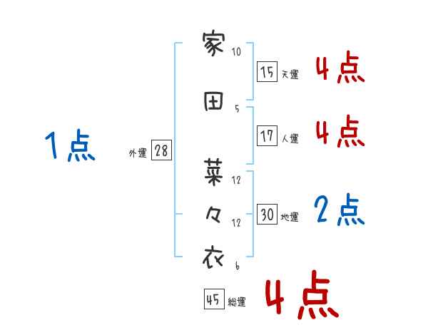 総運![]() | 家田菜々衣さんの総運は45画の4つ星!もくもくと物事を進め達成する。地味な努力家。 あなたの人生を表す1番重要な運勢です。生涯を通じて影響する総合運となり、主に50歳以降の晩年期に影響を及ぼします。 |