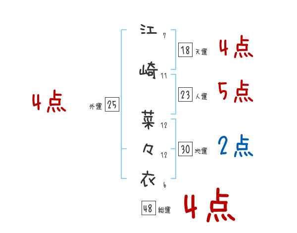 天運![]() | 江崎菜々衣さんの天運は18画の4つ星!情熱的で剛気。忍耐力があり信頼される。 家系が持つ宿命的な運勢を表します。祖先から受け継いだ苗字ですので自分の力が及びません。家柄を象徴します。 |