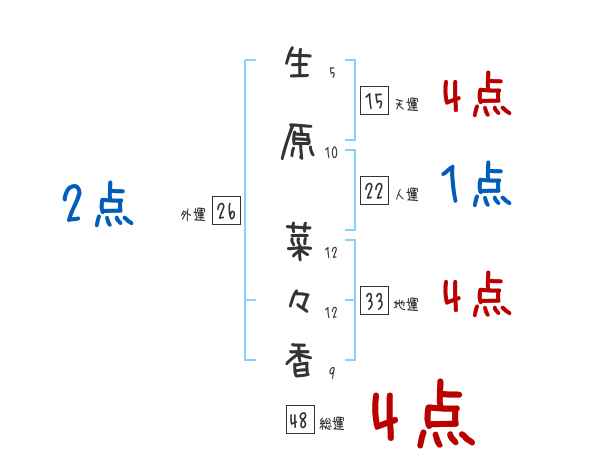 外運![]() | 生原菜々香さんの外運は26画の2つ星!波瀾万丈かも。信頼できる人を大事にしましょう。 生活面を象徴する運勢です。外部から受ける影響力を表し、結婚運、家庭運や職場、環境への順応性を表します。 |