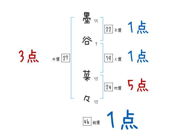 天運![]() | 墨谷菜々さんの天運は22画の1つ星!努力することが苦手ないっぽう手先が器用。芸術性にも優れる。 家系が持つ宿命的な運勢を表します。祖先から受け継いだ苗字ですので自分の力が及びません。家柄を象徴します。 |