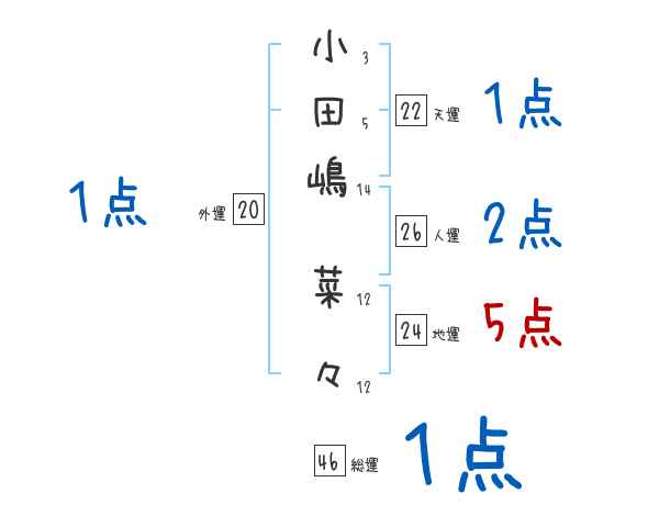 総運![]() | 小田嶋菜々さんの総運は46画の1つ星!迷走することが多く苦労するかも。目先のことにとらわれないように。 あなたの人生を表す1番重要な運勢です。生涯を通じて影響する総合運となり、主に50歳以降の晩年期に影響を及ぼします。 |