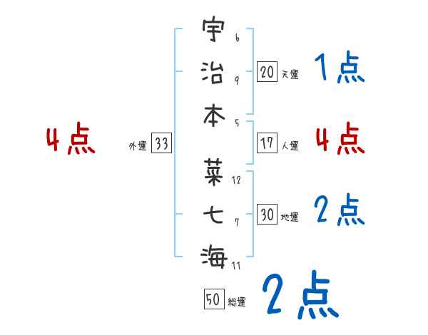外運![]() | 宇治本菜七海さんの外運は33画の4つ星!権力志向でプライドが高い。勇気があり運を切り開き成功する。 生活面を象徴する運勢です。外部から受ける影響力を表し、結婚運、家庭運や職場、環境への順応性を表します。 |