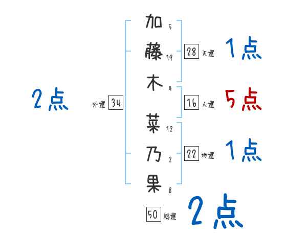 人運![]() | 加藤木菜乃果さんの人運は16画の5つ星!人望が厚く大きく発展する。逆転成功が見える。 性格や才能などを表す2番目に重要な運勢です。人間関係や協調性、社会的な成功に影響します。主に20歳から50歳ぐらいまでの中年期の運勢を表します。 |