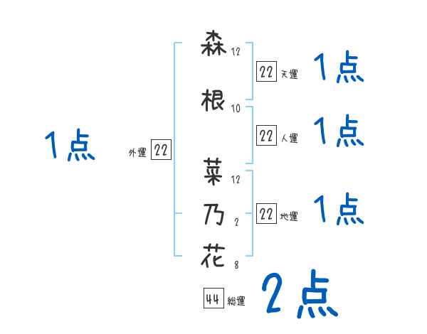 外運![]() | 森根菜乃花さんの外運は22画の1つ星!努力することが苦手ないっぽう手先が器用。芸術性にも優れる。 生活面を象徴する運勢です。外部から受ける影響力を表し、結婚運、家庭運や職場、環境への順応性を表します。 |