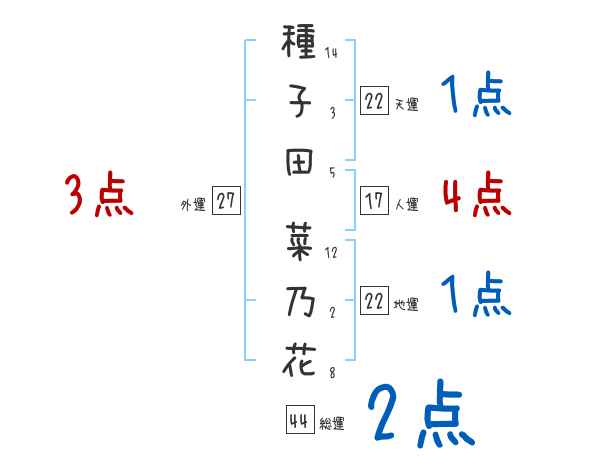 天運![]() | 種子田菜乃花さんの天運は22画の1つ星!努力することが苦手ないっぽう手先が器用。芸術性にも優れる。 家系が持つ宿命的な運勢を表します。祖先から受け継いだ苗字ですので自分の力が及びません。家柄を象徴します。 |