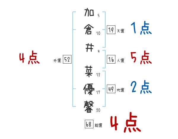総運![]() | 加倉井菜優馨さんの総運は68画の4つ星!潜在能力が高く集中力が高い。勤勉に励み発展する。 あなたの人生を表す1番重要な運勢です。生涯を通じて影響する総合運となり、主に50歳以降の晩年期に影響を及ぼします。 |