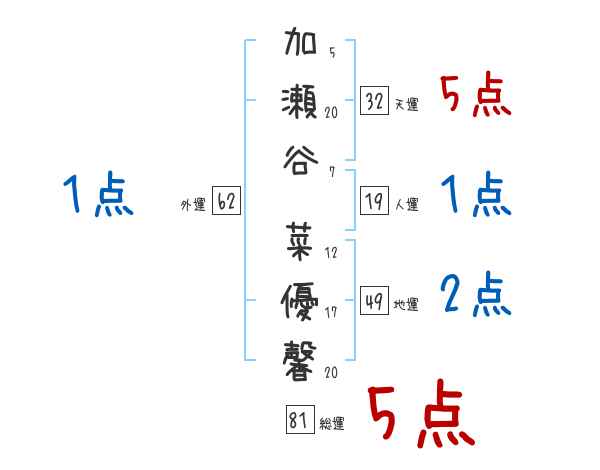 総運![]() | 加瀬谷菜優馨さんの総運は81画の5つ星!行動力、指導力があり出世し繁栄する。幸運に恵まれる。 あなたの人生を表す1番重要な運勢です。生涯を通じて影響する総合運となり、主に50歳以降の晩年期に影響を及ぼします。 |