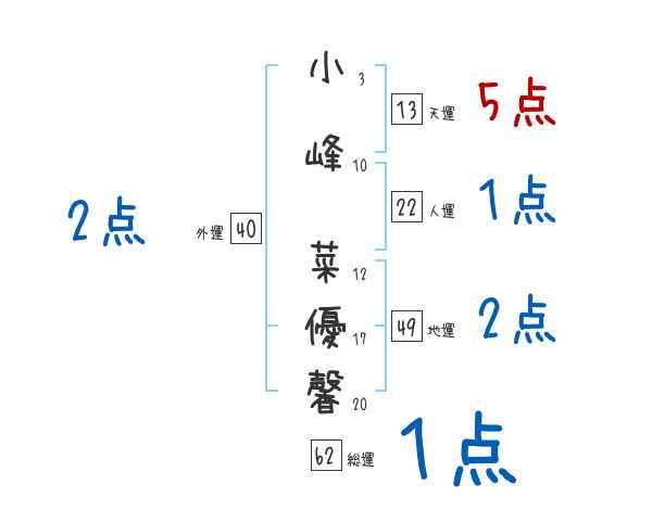 人運![]() | 小峰菜優馨さんの人運は22画の1つ星!努力することが苦手ないっぽう手先が器用。芸術性にも優れる。 性格や才能などを表す2番目に重要な運勢です。人間関係や協調性、社会的な成功に影響します。主に20歳から50歳ぐらいまでの中年期の運勢を表します。 |