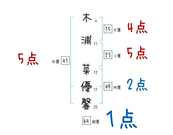 人運![]() | 木浦菜優馨さんの人運は23画の5つ星!想像力に優れ活力がある。一代で成功し名誉を手に入れる。 性格や才能などを表す2番目に重要な運勢です。人間関係や協調性、社会的な成功に影響します。主に20歳から50歳ぐらいまでの中年期の運勢を表します。 |