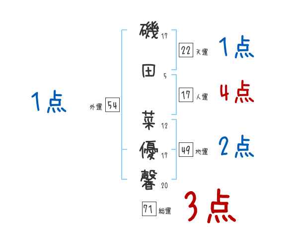 外運![]() | 磯田菜優馨さんの外運は54画の1つ星!トラブルが多いかも。周りをよく見て協調して過ごしましょう。 生活面を象徴する運勢です。外部から受ける影響力を表し、結婚運、家庭運や職場、環境への順応性を表します。 |