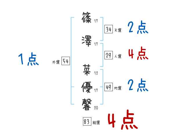 外運![]() | 篠澤菜優馨さんの外運は54画の1つ星!トラブルが多いかも。周りをよく見て協調して過ごしましょう。 生活面を象徴する運勢です。外部から受ける影響力を表し、結婚運、家庭運や職場、環境への順応性を表します。 |
