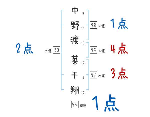 天運![]() | 中野渡菜千翔さんの天運は28画の1つ星!家庭環境に注意。スポーツで活躍できる能力があるかも。 家系が持つ宿命的な運勢を表します。祖先から受け継いだ苗字ですので自分の力が及びません。家柄を象徴します。 |
