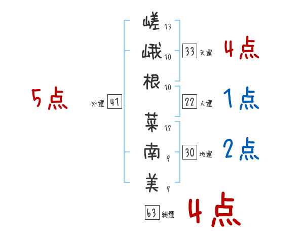 総運![]() | 嵯峨根菜南美さんの総運は63画の4つ星!家庭運がよく順調な生活。温和な性格。 あなたの人生を表す1番重要な運勢です。生涯を通じて影響する総合運となり、主に50歳以降の晩年期に影響を及ぼします。 |