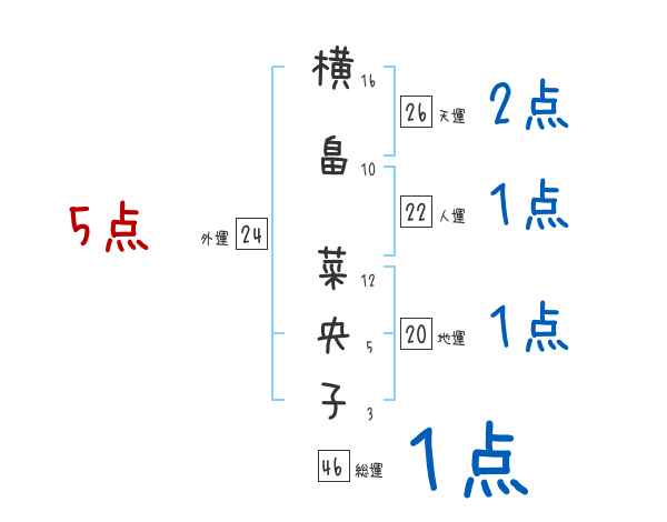 外運![]() | 横畠菜央子さんの外運は24画の5つ星!家庭運が良く順調な人生。金運にも恵まれる。 生活面を象徴する運勢です。外部から受ける影響力を表し、結婚運、家庭運や職場、環境への順応性を表します。 |