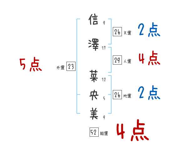 外運![]() | 信澤菜央美さんの外運は23画の5つ星!想像力に優れ活力がある。一代で成功し名誉を手に入れる。 生活面を象徴する運勢です。外部から受ける影響力を表し、結婚運、家庭運や職場、環境への順応性を表します。 |