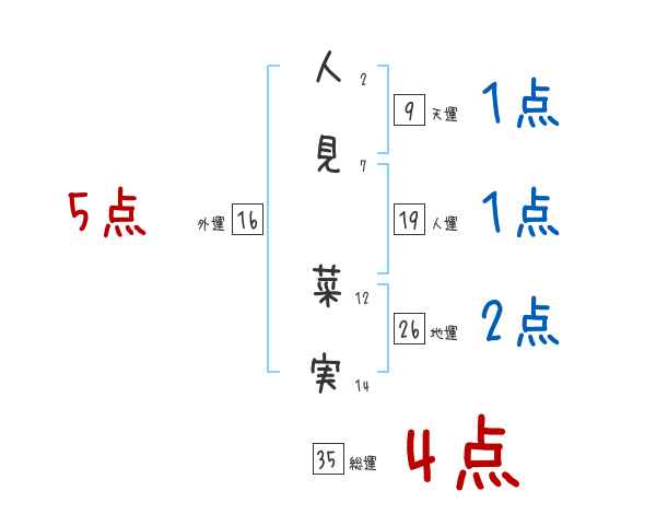 総運![]() | 人見菜実さんの総運は35画の4つ星!温厚な性格で感受性が高い。穏和な性格で人望が厚い。 あなたの人生を表す1番重要な運勢です。生涯を通じて影響する総合運となり、主に50歳以降の晩年期に影響を及ぼします。 |