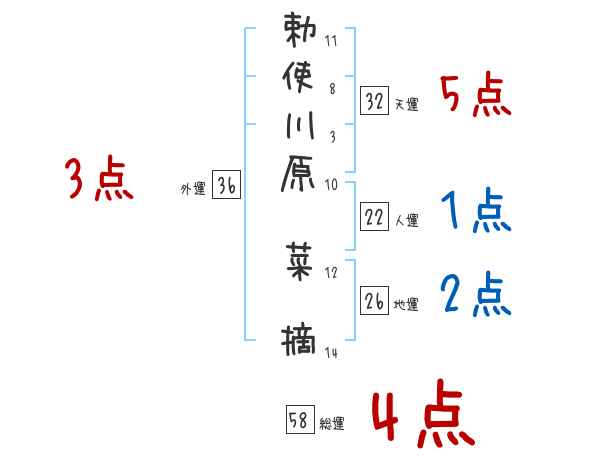 天運![]() | 勅使川原菜摘さんの天運は32画の5つ星!柔軟性があり成功する。チャンスが多く金運が良い。 家系が持つ宿命的な運勢を表します。祖先から受け継いだ苗字ですので自分の力が及びません。家柄を象徴します。 |