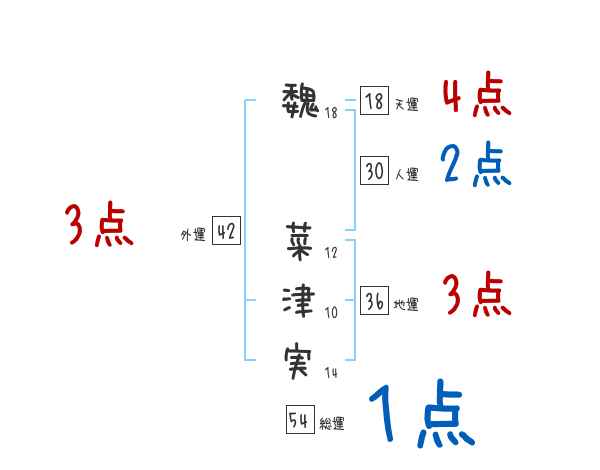 天運![]() | 魏菜津実さんの天運は18画の4つ星!情熱的で剛気。忍耐力があり信頼される。 家系が持つ宿命的な運勢を表します。祖先から受け継いだ苗字ですので自分の力が及びません。家柄を象徴します。 |