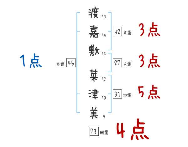 総運![]() | 渡嘉敷菜津美さんの総運は73画の4つ星!天徳のある人生。散財に注意すれば晩年幸福。 あなたの人生を表す1番重要な運勢です。生涯を通じて影響する総合運となり、主に50歳以降の晩年期に影響を及ぼします。 |