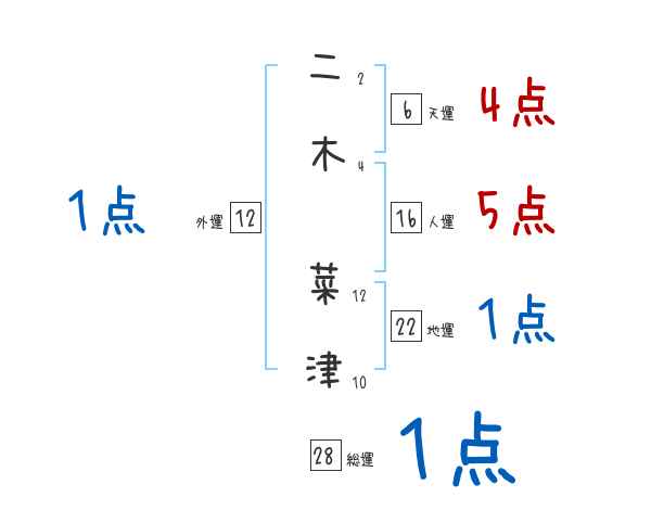 人運![]() | 二木菜津さんの人運は16画の5つ星!人望が厚く大きく発展する。逆転成功が見える。 性格や才能などを表す2番目に重要な運勢です。人間関係や協調性、社会的な成功に影響します。主に20歳から50歳ぐらいまでの中年期の運勢を表します。 |