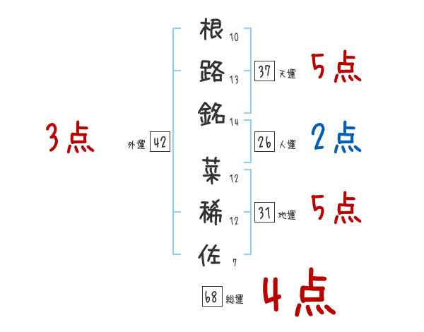 総運![]() | 根路銘菜稀佐さんの総運は68画の4つ星!潜在能力が高く集中力が高い。勤勉に励み発展する。 あなたの人生を表す1番重要な運勢です。生涯を通じて影響する総合運となり、主に50歳以降の晩年期に影響を及ぼします。 |