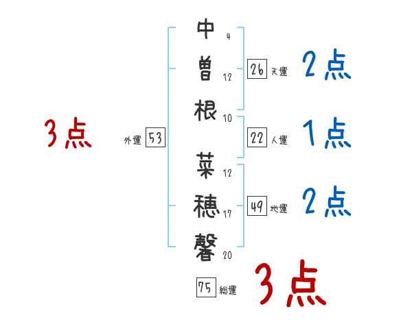 外運![]() | 中曽根菜穂馨さんの外運は53画の3つ星!やや見栄っ張りで虚栄心がある。散財に注意。 生活面を象徴する運勢です。外部から受ける影響力を表し、結婚運、家庭運や職場、環境への順応性を表します。 |