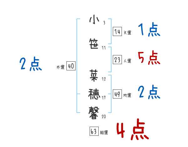 天運![]() | 小笹菜穂馨さんの天運は14画の1つ星!人に対して優しいがストレスを溜め込みがち。人間関係のトラブルを避けるよう気をつけましょう。 家系が持つ宿命的な運勢を表します。祖先から受け継いだ苗字ですので自分の力が及びません。家柄を象徴します。 |