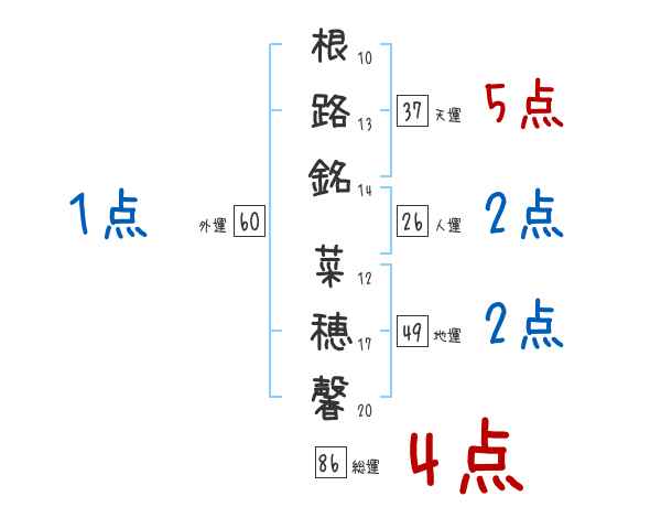総運![]() | 根路銘菜穂馨さんの総運は86画の4つ星!慎重な努力家で信頼を得る。誠実な精神で向上心に優れる。 あなたの人生を表す1番重要な運勢です。生涯を通じて影響する総合運となり、主に50歳以降の晩年期に影響を及ぼします。 |