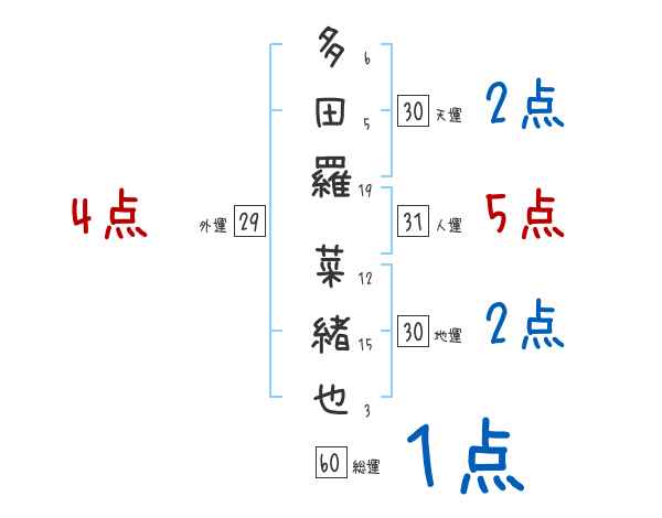 天運![]() | 多田羅菜緒也さんの天運は30画の2つ星!浮き沈みの激しさに注意しましょう。 家系が持つ宿命的な運勢を表します。祖先から受け継いだ苗字ですので自分の力が及びません。家柄を象徴します。 |