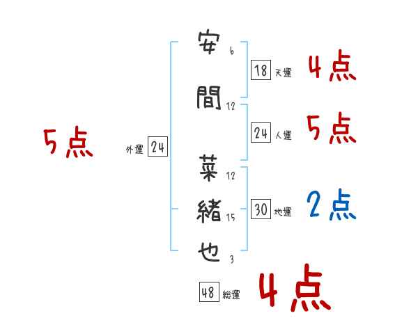 人運![]() | 安間菜緒也さんの人運は24画の5つ星!家庭運が良く順調な人生。金運にも恵まれる。 性格や才能などを表す2番目に重要な運勢です。人間関係や協調性、社会的な成功に影響します。主に20歳から50歳ぐらいまでの中年期の運勢を表します。 |