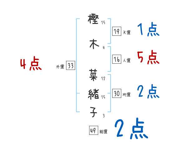 外運![]() | 樫木菜緒子さんの外運は33画の4つ星!権力志向でプライドが高い。勇気があり運を切り開き成功する。 生活面を象徴する運勢です。外部から受ける影響力を表し、結婚運、家庭運や職場、環境への順応性を表します。 |